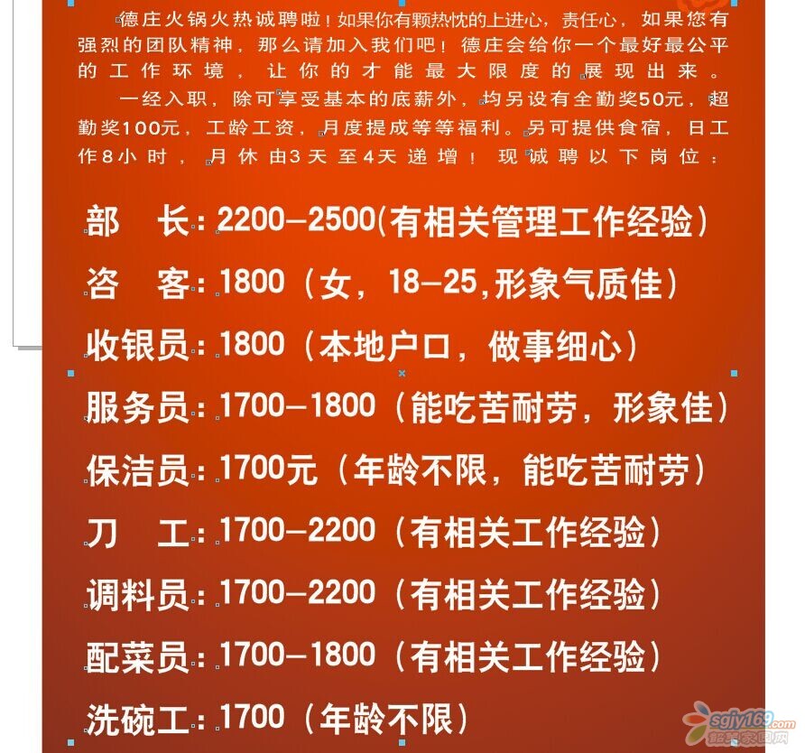 正文摘要:本帖最后由 天笑 于 2014-9-9 19:10 編輯 重莊德莊火鍋百年東街韶關(guān)店位于湞江區(qū)百年東街C區(qū)三樓1-3-08,為迎接冬季,亦是火鍋旺季。我公司現(xiàn)對外招聘各路人才,凡對餐飲行業(yè)充滿熱情 ... |