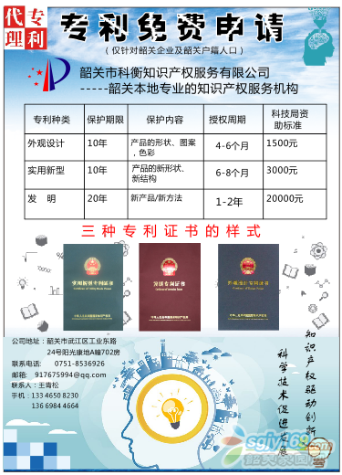 正文摘要:專利免費申請!!!(僅對韶關(guān)企業(yè)和戶籍人口)韶關(guān)市科衡知識產(chǎn)權(quán)服務(wù)有限公司-----韶關(guān)本地專業(yè)的知識產(chǎn)權(quán)服務(wù)機(jī)構(gòu)地址:韶關(guān)市武江區(qū)工業(yè)東路24號陽光康地A棟702房電話:0751-8536926聯(lián)系人:王工手 機(jī) ... |