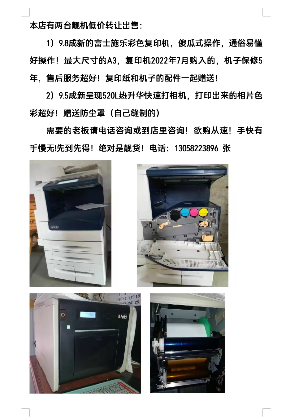 1)9.8成新的富士施樂彩色復(fù)印機(jī),傻瓜式操作,通俗易懂好操作!最大尺寸的A3,復(fù)印機(jī)2022年7月購入的,機(jī)子保修5年,售后服務(wù)超好!復(fù)印紙和機(jī)子的配件一起贈(zèng)送! 2)9.5成新呈現(xiàn)520L熱升華快速打相機(jī),打印出來的相片色彩超好!贈(zèng)送防塵罩(自己縫制的) 更多信息